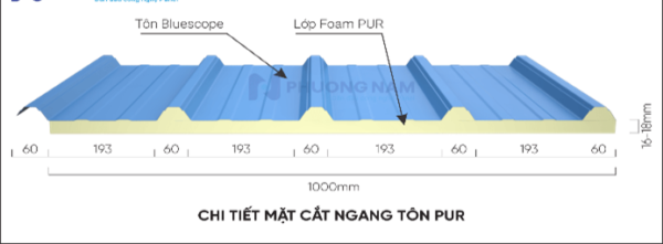 Phương án 2: Sử dụng tấm lợp Panel PU ở giữa 2 lớp tole, có khả năng cách âm cách nhiệt tốt. Mặt dưới tấm mái phẳng |